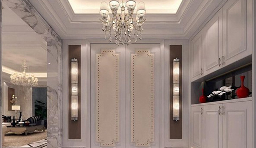 四、燈光:玄關區一般都不會緊挨窗戶,要想利用自然光的介入來提高區間的光感是不可奢求的。因此,必須通過合理的燈光設計來烘托玄關明朗、溫暖的氛圍。一般在玄關處可配置較大的吊燈或吸頂燈作主燈,再添置些射燈、壁燈、熒光燈等作輔助光源。還可以運用一些光線朝上射的小型地燈作點綴,還可以運用冷色調的光源傳達冬意的沉靜。