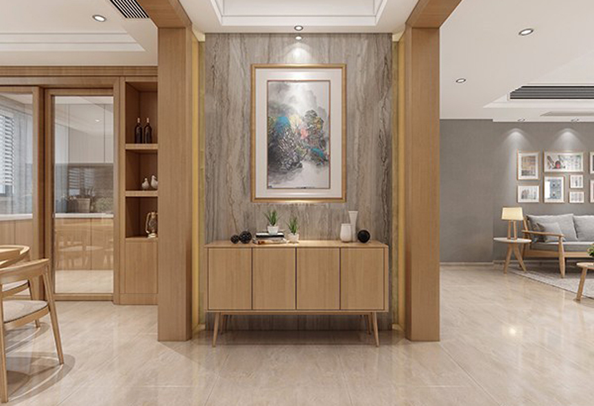二、地面:玄關地面是家里使用頻率最高的地方。因此,玄關地面的材料要具備耐磨、易清洗的特點,地面的裝修通常依整體裝飾風格的具體情況而定,一般用于地面的鋪設材料有玻璃、木地板、石材或地磚等。如果您想讓玄關的區域與客廳有所分別的話,可以選擇鋪設與客廳顏色不一的地磚。還可以把玄關的地面升高,在與客廳的連接處做成一個小斜面,以突出玄關的特殊地位。
